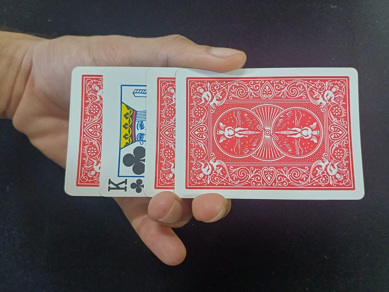 Perform one of the most visual card tricks ever with only four cleverly designed cards. A king dramatically rises through a spread of cards one by one. It looks like trick photography!