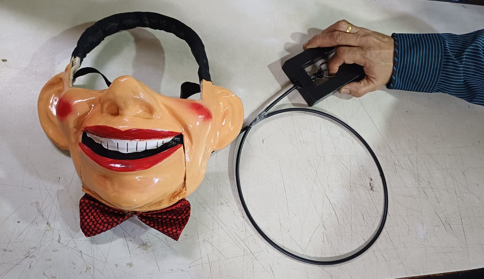 Routine : Ventriloquist invites a person from the audience to assist him for the ventriloquist act. The Human Half mask is attached onto the face of the person . The person is requested to look at the ventriloquist whenever the jaw of the mouth opens . As the ventriloquist throws his voice and talks to the person wearing the mask it creates an impression that the puppet is talking.